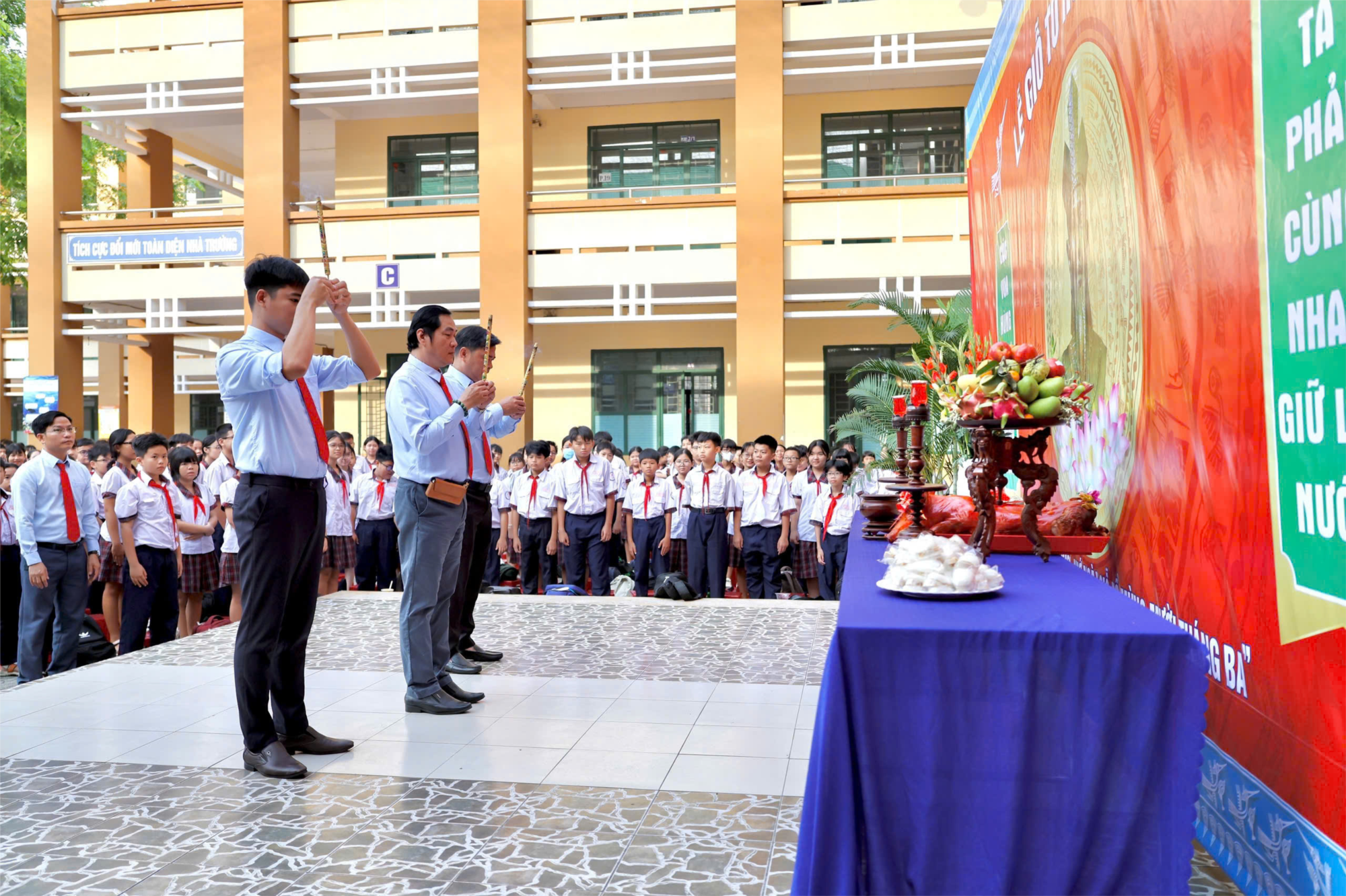Buổi lễ diễn ra trong không khí trang nghiêm với sự tham dự của Ban Giám hiệu, các thầy cô giáo cùng toàn thể học sinh. Buổi lễ không chỉ giúp các em hiểu hơn về lịch sử dân tộc mà còn khơi dậy lòng tự hào, tinh thần đoàn kết và ý thức trách nhiệm trong việc gìn giữ, phát huy những giá trị truyền thống. Đây là hoạt động ý nghĩa, góp phần giáo dục thế hệ trẻ biết trân trọng và kế thừa di sản quý báu mà cha ông để lại.