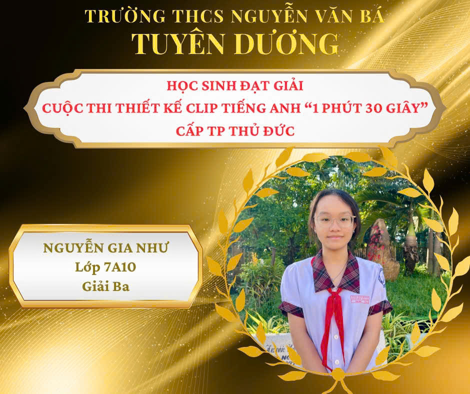 Với tinh thần sáng tạo và sự nỗ lực không ngừng, các em học sinh của Trường THCS Nguyễn Văn Bá đã xuất sắc đạt giải trong Cuộc thi thiết kế clip Tiếng Anh “1 phút 30 giây” cấp TP Thủ Đức. Đây là thành quả xứng đáng cho sự cố gắng của các em và sự hướng dẫn tận tâm của đội ngũ giáo viên nhà trường.